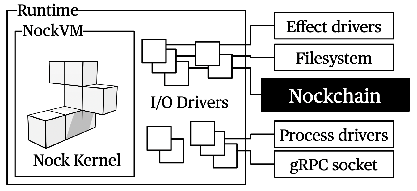For example, the Nockchain wallet has a runtime that handles command-line arguments and Nockchain connectivity, and a kernel that contains the business logic for managing keys, constructing transactions, and interpreting blockchain state. When you query your balance, the runtime fetches data and the kernel processes it. When you send a transaction, the kernel validates and signs it, then the runtime broadcasts it.