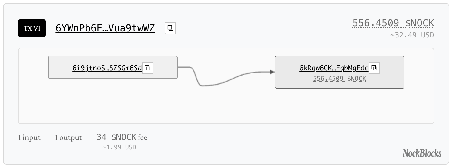 Lock-root: the hash of the recipient's lock script. This determines who can spend the output note and under what conditions. One doesn't need to know the full lock tree, just its hash. The recipient provides the full lock when they eventually spend.Note-data: an optional key-value data to attach to the output note. This is limited to prevent blockchain bloat. Applications can use this for metadata, state information, or protocol-specific data that needs to travel with the value.Gift: the amount of nicks being transferred. This is the actual value moving to the output note.Parent-hash: a hash of the note one is spending. This creates an immutable link between inputs and outputs, preventing hash loops in proof generation. Every seed commits to its source, creating a traceable lineage back through the transaction graph.