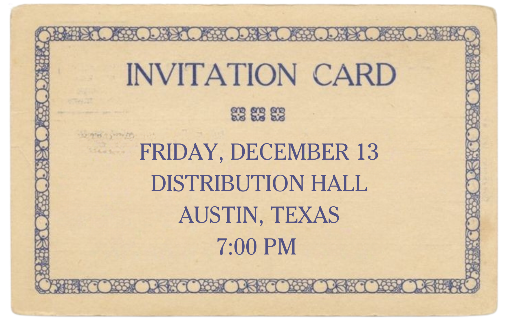 We request the pleasure of your company for drinks and light fare on Friday, the 13th of December, at seven o'clock in Austin, Texas.